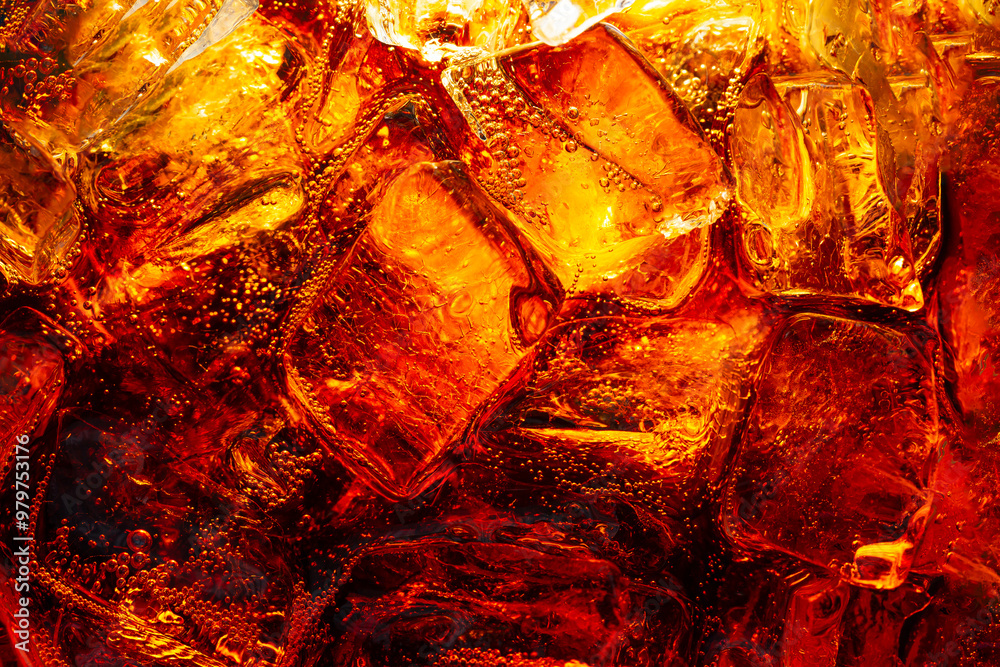Close-up of cola drink and ice,Background of cola with ice and bubbles,macro cola background,Background of cola with ice and bubbles. Side view background of refreshing cola flavored soda with carbona