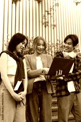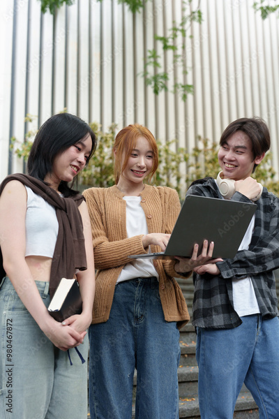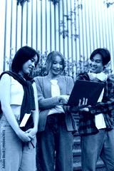 Bright Asian College Student Cheerful people use laptops and tablets to study with a group of classmates. Study outside in a fun way with good friends and social media. Concept of online education.