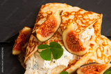 Crepes or thin pancakes with gorgonzola cheese, honey and figs fruits