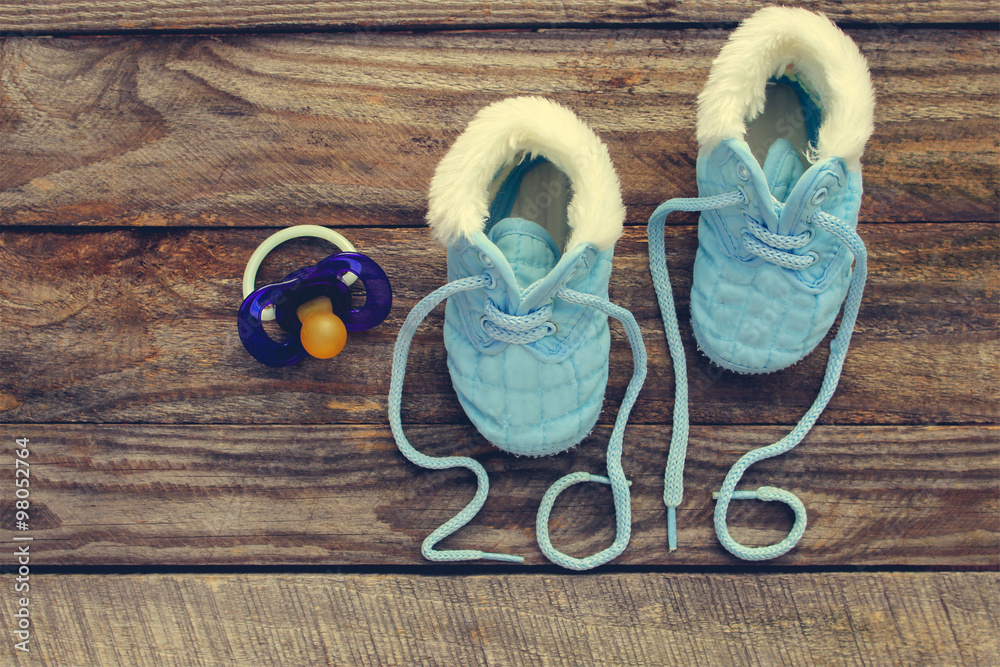 2016 year written laces of children's shoes and a pacifier on the old wooden background. Toned image