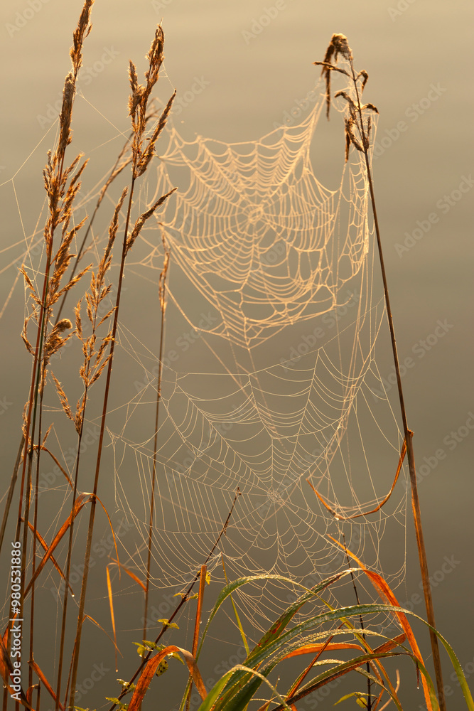 Pajęczyny wśród traw. Wschód słońca.