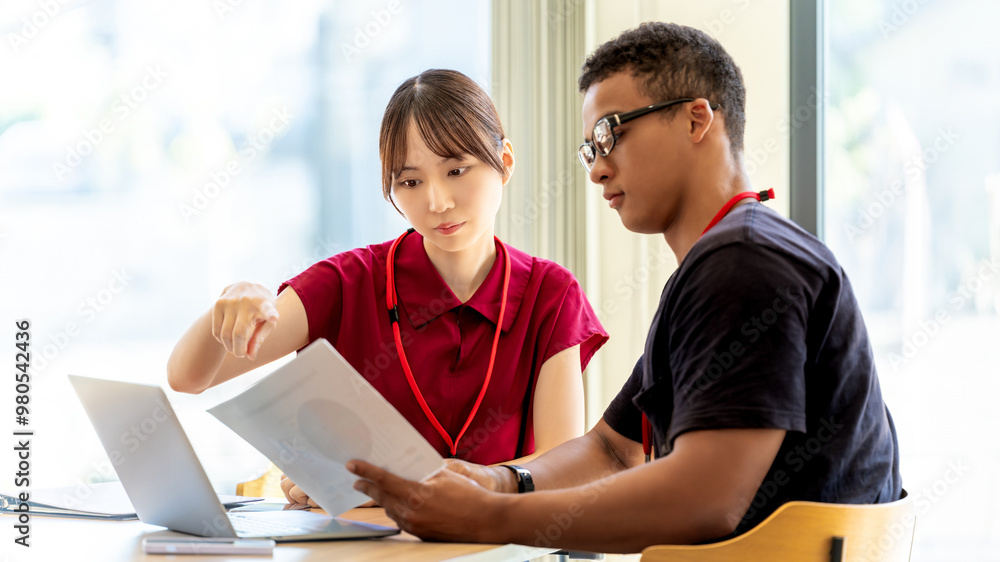 ミーティングをする男女2人のビジネスマン・日本人女性と外国人男性