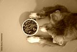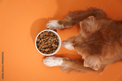 A Nova Scotia Duck Tolling Retriever is viewed from above, looking at a food bowl on an orange background. The top-down angle highlights the dog concentration.