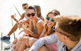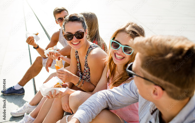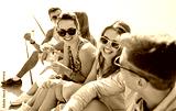 group of smiling friends sitting on city square