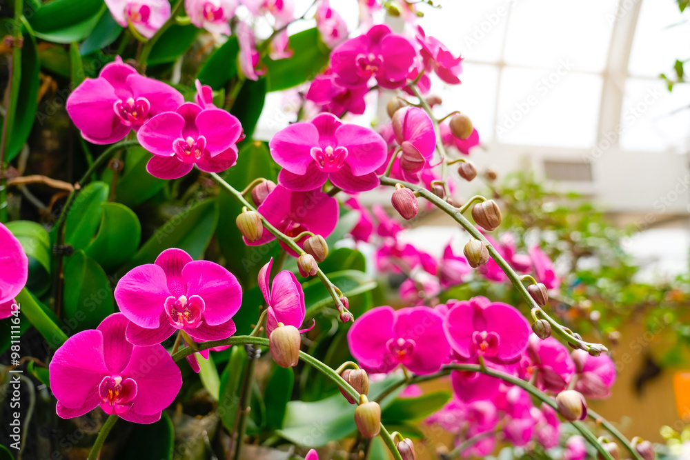 Beautiful Phalaenopsis pink purple orchids with beautiful flowers and green leaves.
