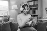 Woman happily using smartphone and headphones while sitting on blue sofa in home office