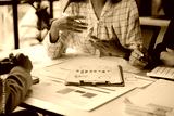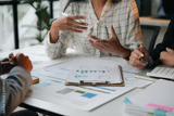 Businesswoman leads a meeting with colleagues, using gestures to brainstorm ideas and analyze charts and graphs on the table