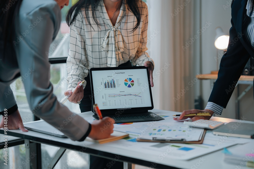 Business professionals collaborating on a project, examining financial data on a tablet during a productive meeting
