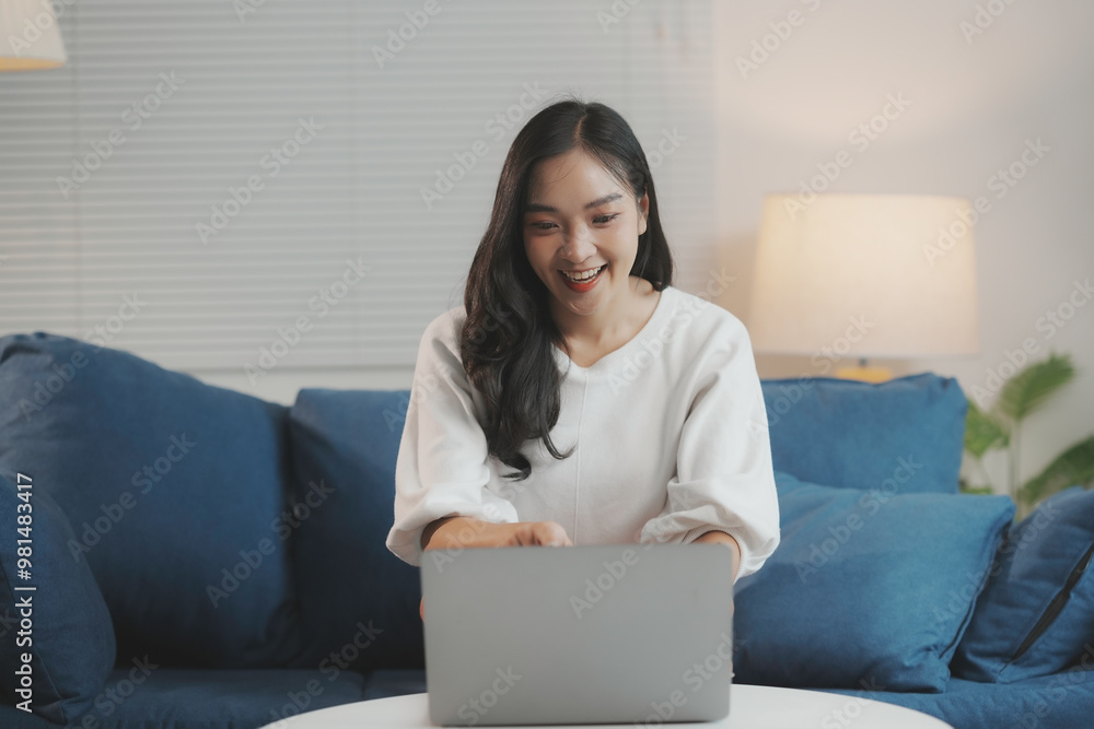 Young asian woman sitting on a blue couch, happily working from home on her laptop