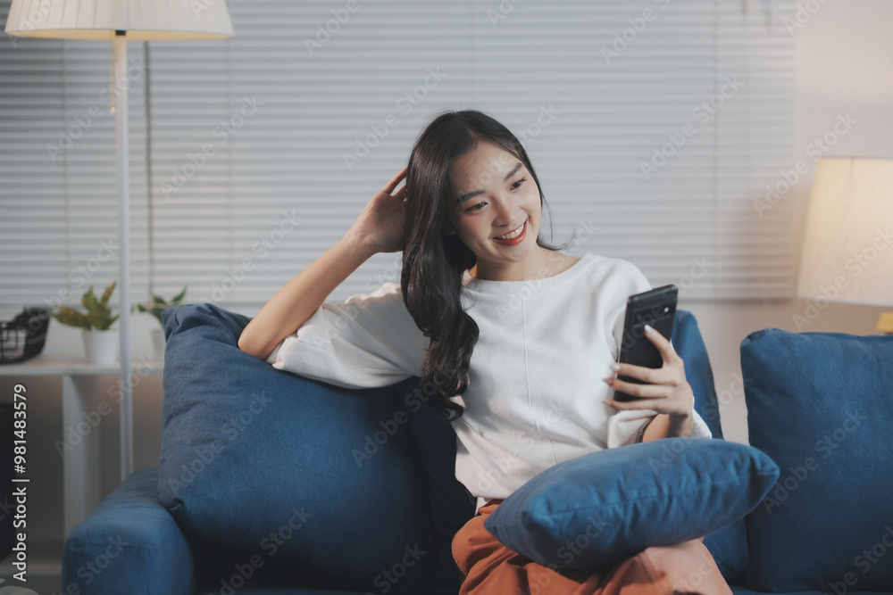 Young asian woman happily using her smartphone in a cozy living room at night, connecting online after work
