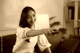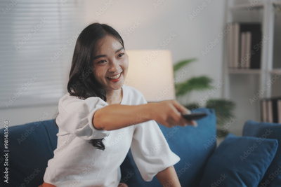 Young woman with a remote control on a blue sofa in her living room, happily flipping through tv channels