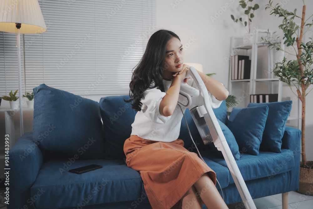 Exhausted asian woman takes a break from housework, sitting on a sofa with a cordless vacuum nearby, looking thoughtful and serene in her modern apartment