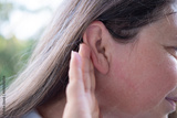 unhappy mature woman holding painful ear, agony earache pain grimace, suffering from health problems, Tinnitus symptom, sharp pain health issue, seeking relief