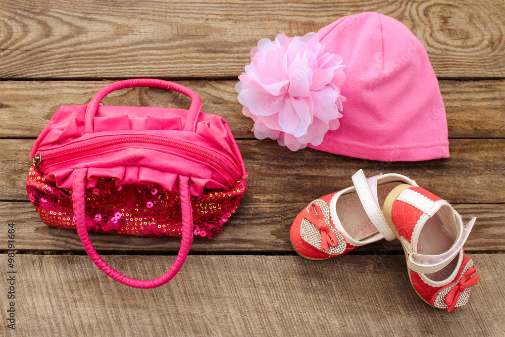 Children's shoes, hat and handbag on wooden background. Toned image.