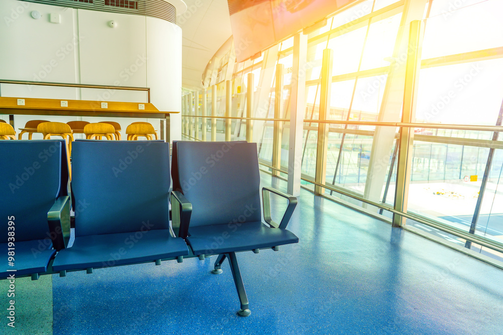 Spacious airport waiting area with empty chairs facing large windows. Places with sockets offering clear view tarmac departing airplane. Bright sunlight creates inside terminal