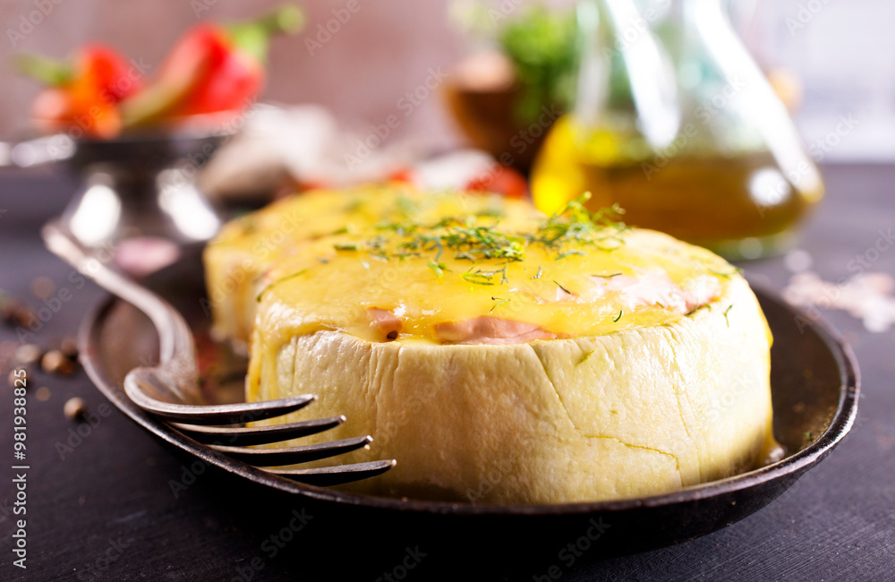 Zucchini stuffed with minced meat and rice, with tomatoes and mozzarella.