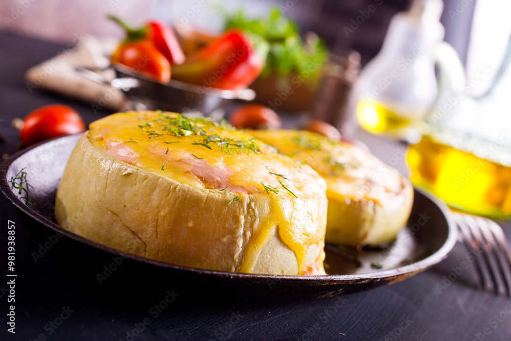 Zucchini stuffed with minced meat and rice, with tomatoes and mozzarella.
