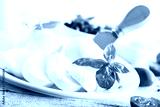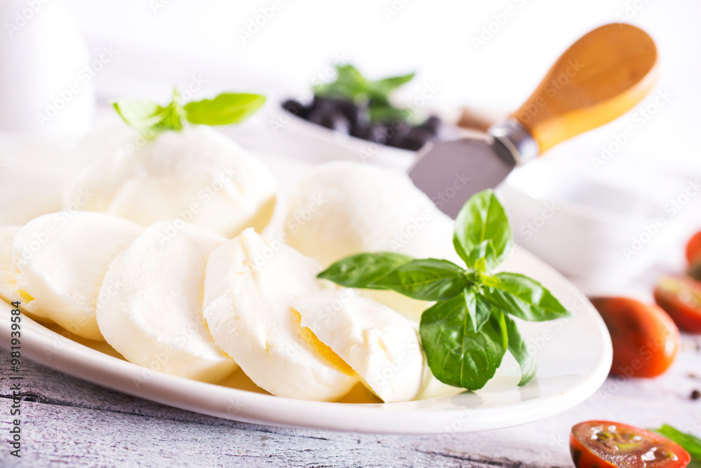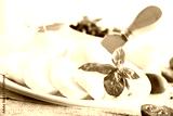 Large ball of mozzarella on white plate topped with herb oil