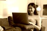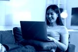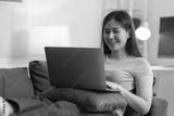 Attractive woman using laptop, mobile phone on sofa in living room relaxing, watching movie, doing research. Learning through the online world Technology and communication concepts.