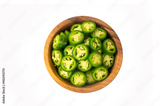 Sliced jalapeno pepper in wooden bowl isolated on white background.