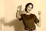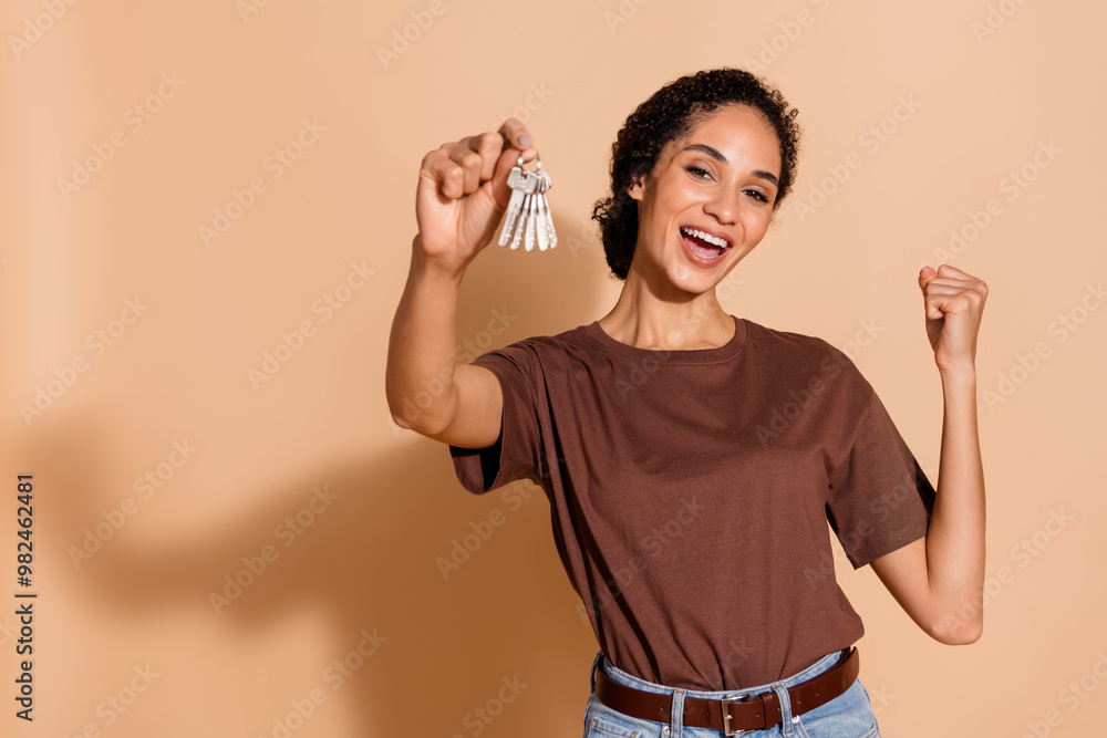 Photo of glad cheerful nice woman wear stylish clothes hold buy new house empty space isolated on beige color background
