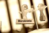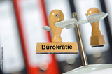 Ein Holzstempel ist beschriftet mit dem Aufdruck Bürokratie vor einem Aktenschrank