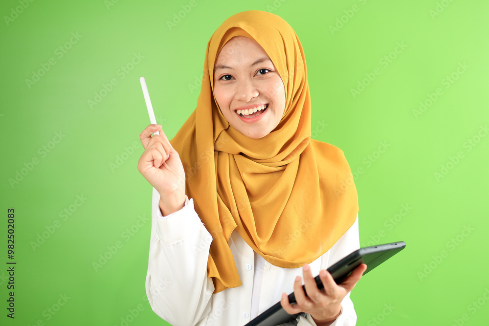 Asian Hijab Girl Holding Tab and Pen, Smiling at the Camera