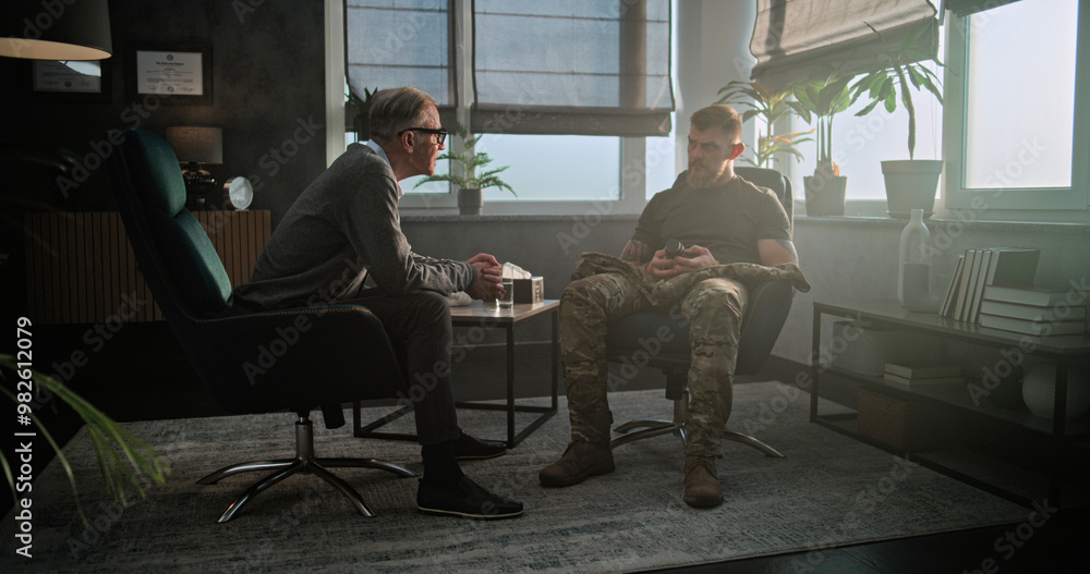 Senior psychiatrist talks to patient, gives antidepressants or sedative medicines to military man with PTSD. Psychotherapist conducts psychological therapy or post war rehabilitation for soldier.