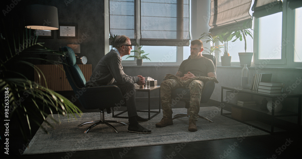 Professional therapist conducts psychotherapy session or psychological post war rehabilitation for military man. Senior psychiatrist gives sedative drugs or antidepressants to soldier with PTSD.