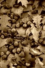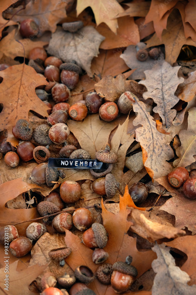 autumn background. fallen leaves and acorns of northern red oak (Quercus rubra) close up, natural forest backdrop. top view. symbol of autumn harvest season. November month calendar concept