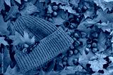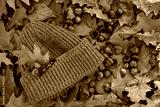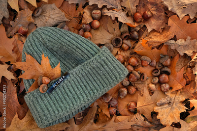 autumn background. knitted hat, fallen leaves and acorns of red oak (Quercus rubra), natural forest backdrop. symbol of autumn harvest season. October month calendar concept. top view