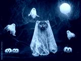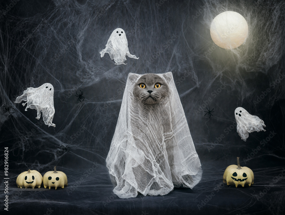 Halloween cat in a ghost costume on night blue background with spiderwebs, pumpkin jack and a glowing moon. Funny cat in a Halloween costume.
