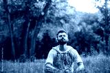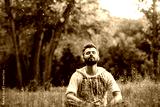 A man sitting on grass in the park and smiling with eyes closed