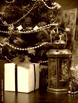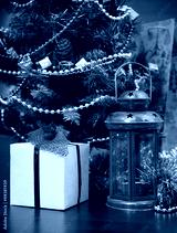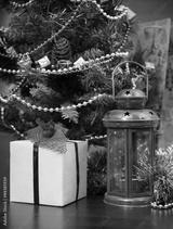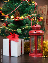 Christmas celebration things: firtree with gifts under it, decor
