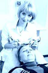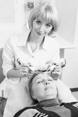 blond woman permanent beautician in a white robe in the office with patsientom.delaet facial massage. Doctor. microcurrents