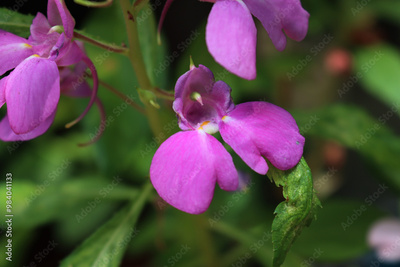 Close-up of pink Impatiens balsamina flowers on selective focus. Also calleds balsam, garden balsam, rose balsam, touch-me-not or spotted snapweed