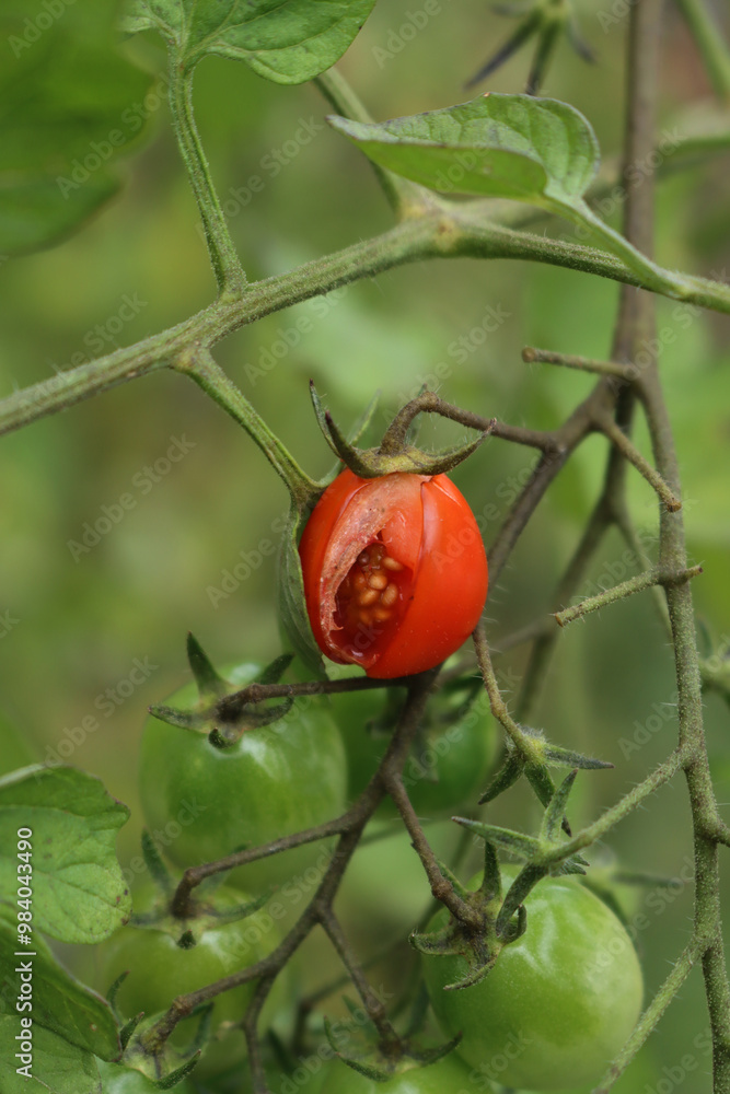 Datterino or Cherry tomatoes damaged by heavy rain on plant in the vegetable garden