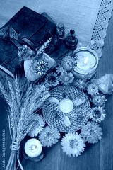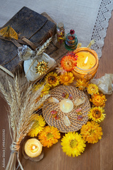 amulets, candles, witchcraft items, spell books, wheat ears and crystals on table. Witchcraft, magic Ritual. ceremony for Lammas, Lughnasadh. wiccan spiritual practice.