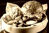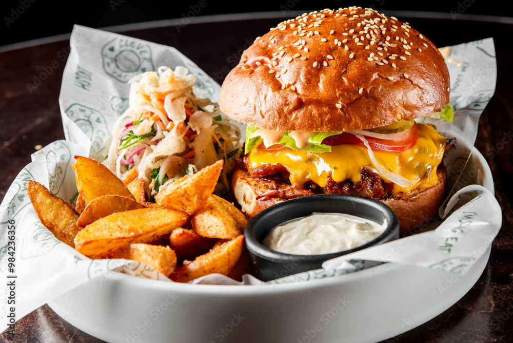 Gourmet cheeseburger with fresh toppings, potato wedges, coleslaw, and dip on dark background