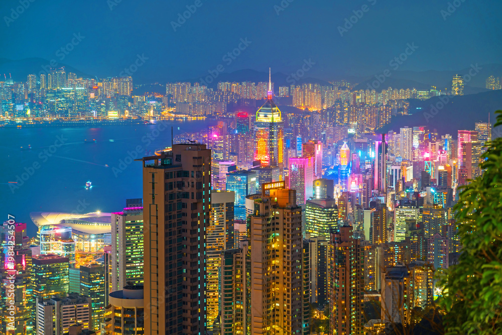 Night view beautiful view of the city and tall buildings in the bay with many bright lights of the modern city the Victoria bay in Hong Kong, China.