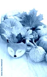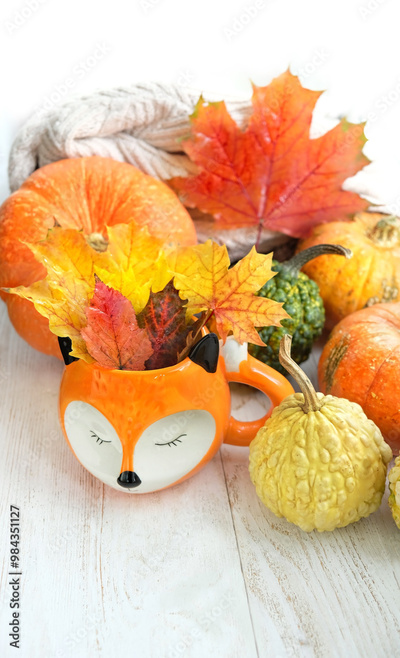 autumn background. fox shape mug, autumn leaves and pumpkins on wooden table close up. composition for cozy home autumn atmosphere. symbol of fall time.
