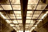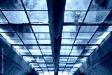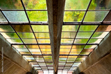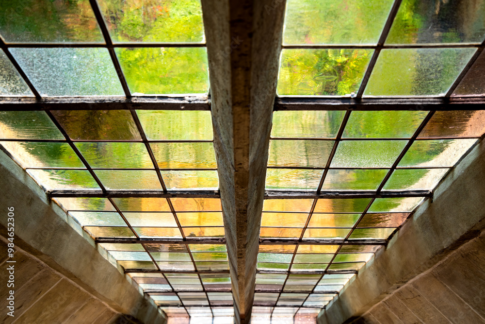 Historic church window with handmade individual panes and metallic frame. Vanishing point perspective from top to bottom. Colorful reflections of the surrounding landscape on a sunny day.