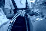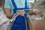 Cropped shot of man plumber holding plumbing hoses at shopping mall
