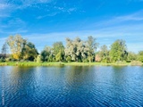 Beautiful blue lake in the park, sky and trees reflection on the lake surface