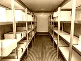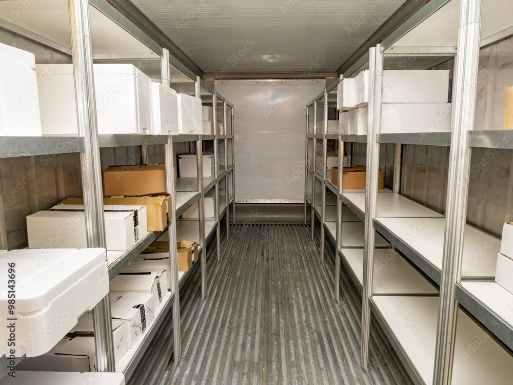 Refrigeration chamber for food storage. Frozen food in boxes are on the shelves of the warehouse.