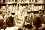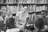 Storytelling, teacher or student with questions in a classroom or library for learning development. Education, kids and children listening to woman with smile and conversation on fun books at school