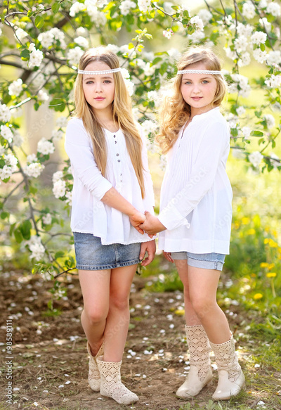 portrait of two girls of girlfriends on a summer nature