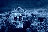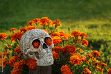 Decorative human Skull and orange marigold flowers outdoor, natural background. cempasuchil flowers - symbol of Mexico's Day of the Dead, dia de los Muertos. magic ritual for Samhain, Halloween