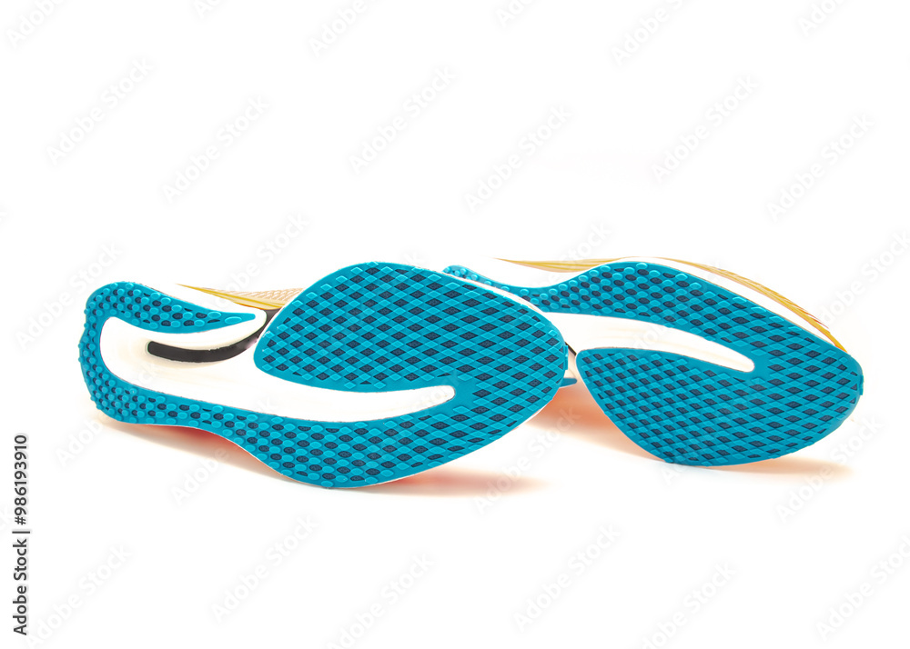 Pair of brand-new racing shoes with rigidness outsole isolated on white, carbon plate to support gait and strikes, soft cushion, energy return, waffle sole carbon reinforced wave bottom geometry