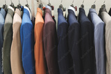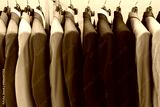 A row of suits hanging on a rack, with the blue suit on the far left and the brown suit on the far right